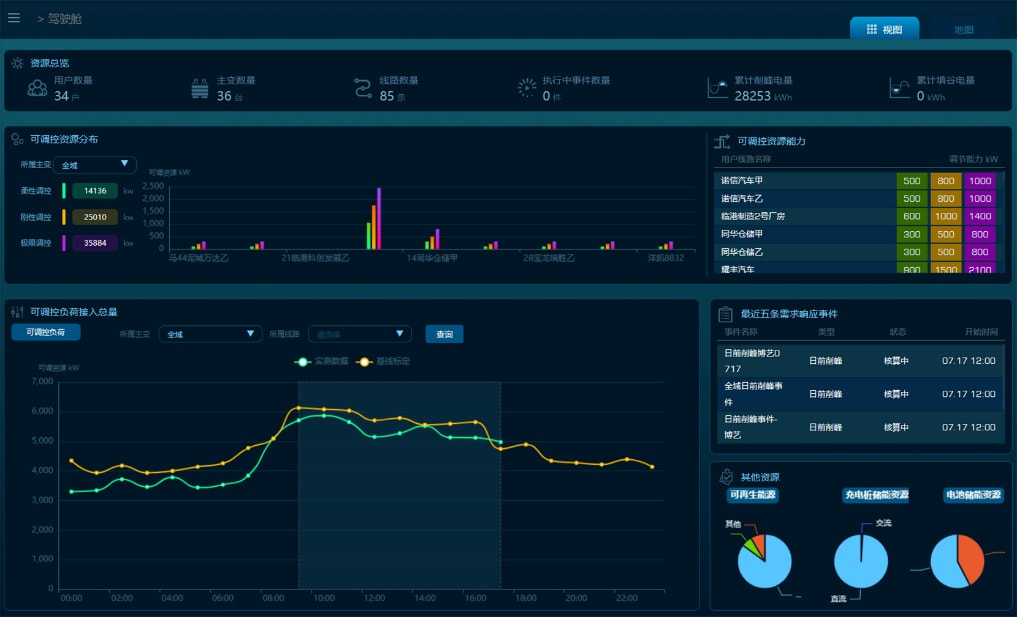 针对海量需求侧灵活性资源接入、聚合调控及交易决策等核心业务需求,依托“云-边-端”智慧物联、人工智能预测和优化调控等关键技术构建虚拟电厂资源聚合平台,实现对虚拟电厂资源全景化、可视化、精细化管理。平台具备用户可调线路管理、可调资源管理、负荷预测分析、需求响应事件管理、响应能力调控测试等功能,支持与储能电池管理系统、建筑能源管理系统、V2G充电站监控系统的接口互联与数据集成,聚合需求侧可调资源参与电网调峰。
